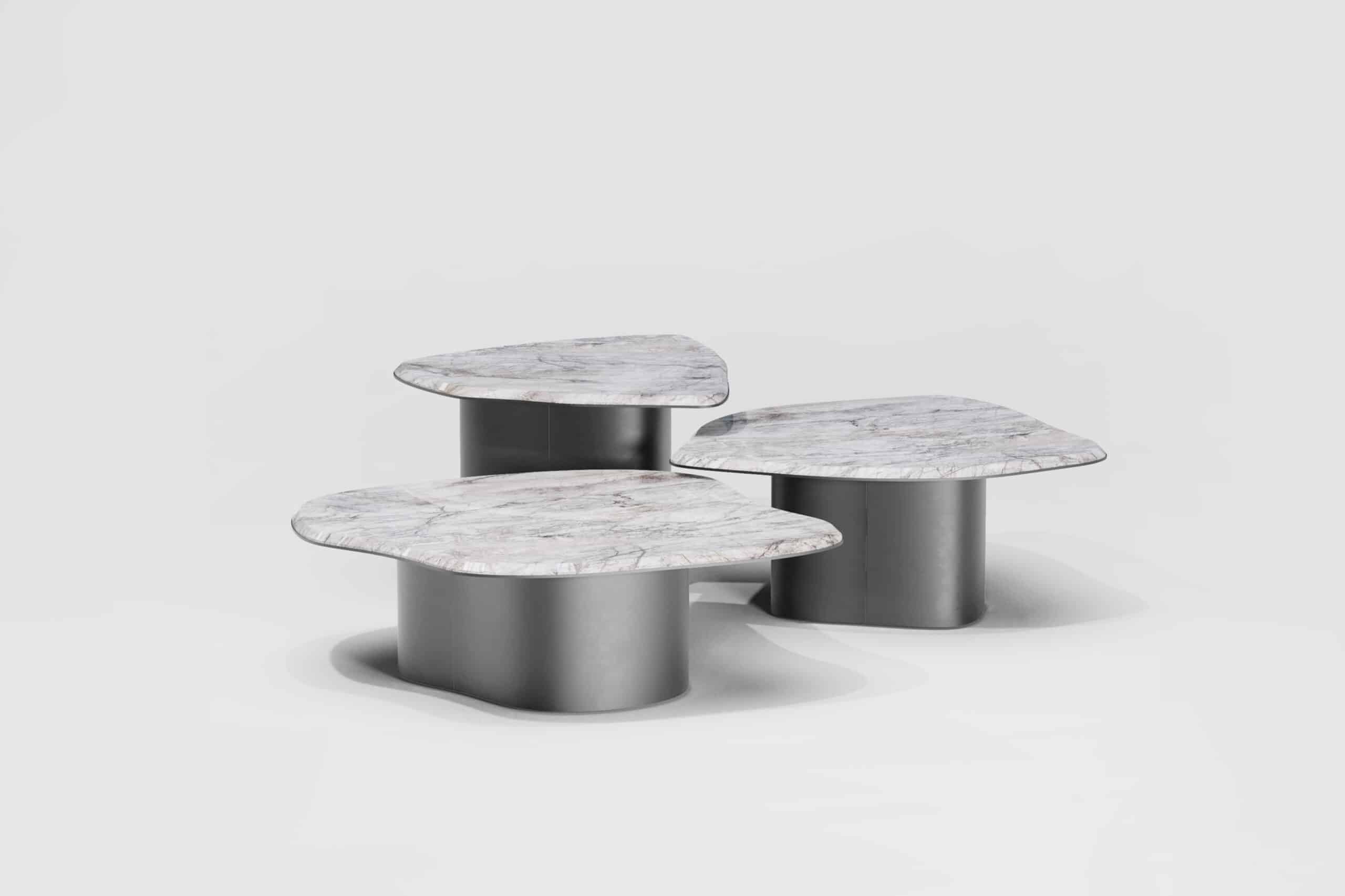 Fragments of an undisclosed time. Irregular pieces of natural stone framed and supported by a metal base. The Fragment coffee tables are a set of three customisable tables at different heights. Available in a number of stone and metal finishes as well as any RAL colour.