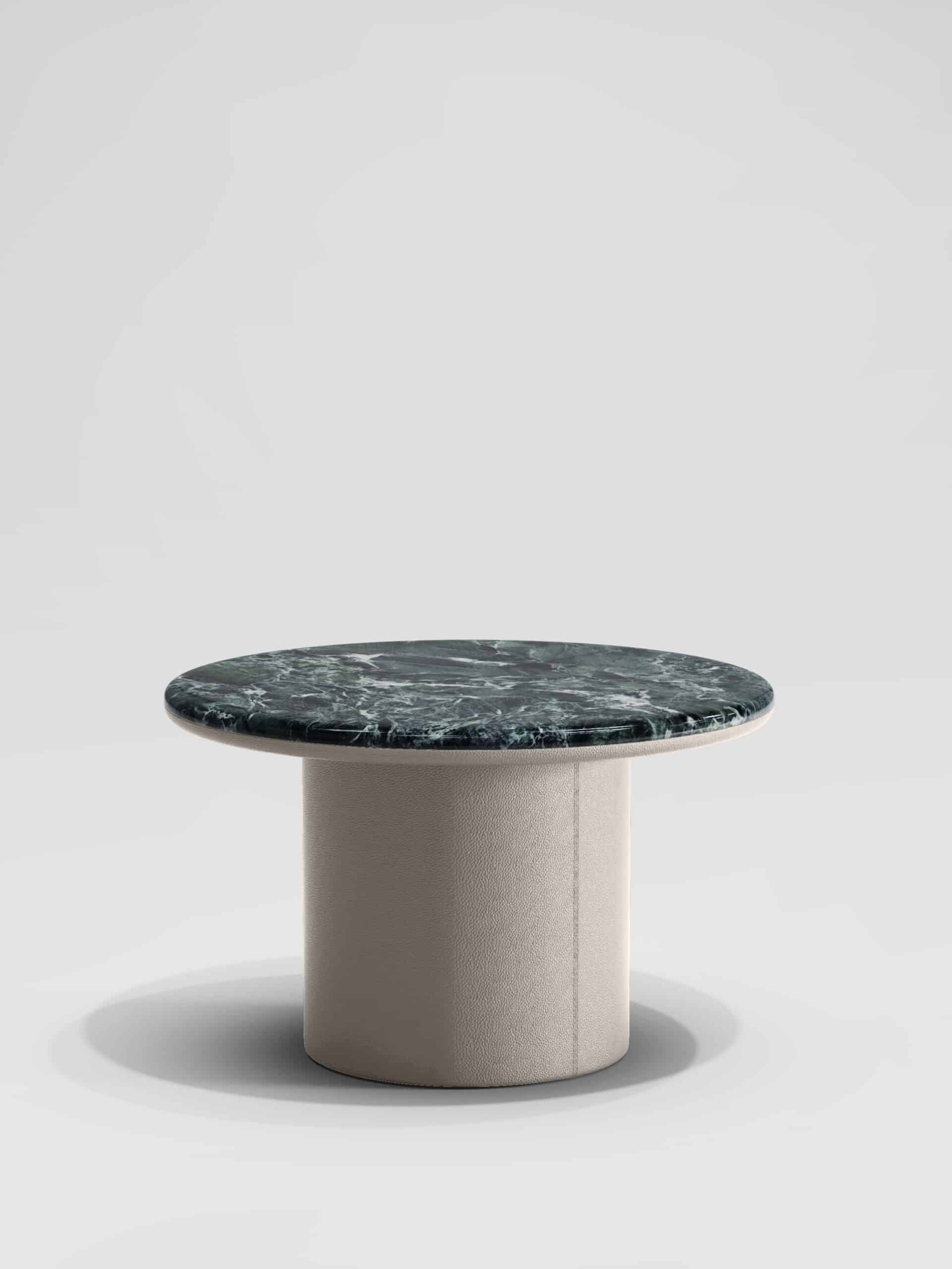 The Gemini Coffee Tables are characterised by the combination of materials on the top and bottom of the table. Leather wraps around the entire base and even continues up the underside of the table top. Half way around the top the leather stops and the table is finished by a marble top with a perfectly curved edge which mirrors the curve of the leather. The Gemini Tables are available in either a round or soft-hex top and in a variety of stone and leather combinations.