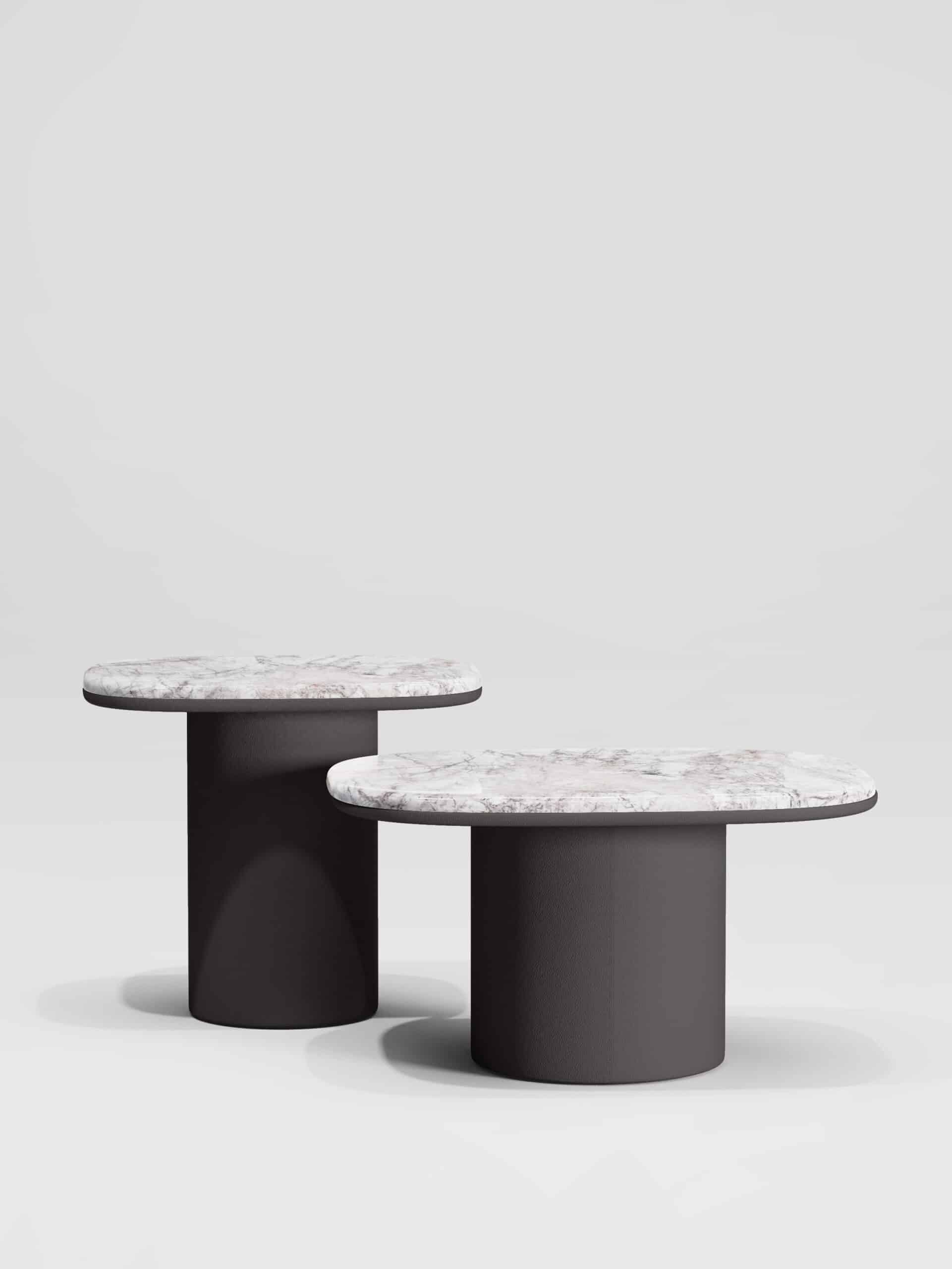 The Gemini Coffee Tables are characterised by the combination of materials on the top and bottom of the table. Leather wraps around the entire base and even continues up the underside of the table top. Half way around the top the leather stops and the table is finished by a marble top with a perfectly curved edge which mirrors the curve of the leather. The Gemini Tables are available in either a round or soft-hex top and in a variety of stone and leather combinations.