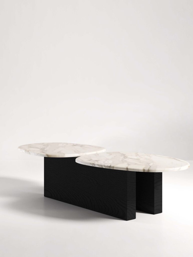 Named after the two seas of Taranto, the Taras Coffee Table consists of two marble or stone pieces held by another two solid wood slabs. The wooden pieces are not connected to one another creating a unique and surprising balancing act. Available in different wood, marble and stone combinations.